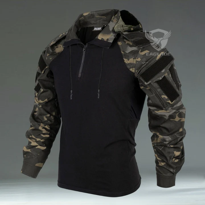 Bluze taktike e lehtë me material të qëndrueshëm, kapuç praktik dhe xhepa funksionalë në krahë.