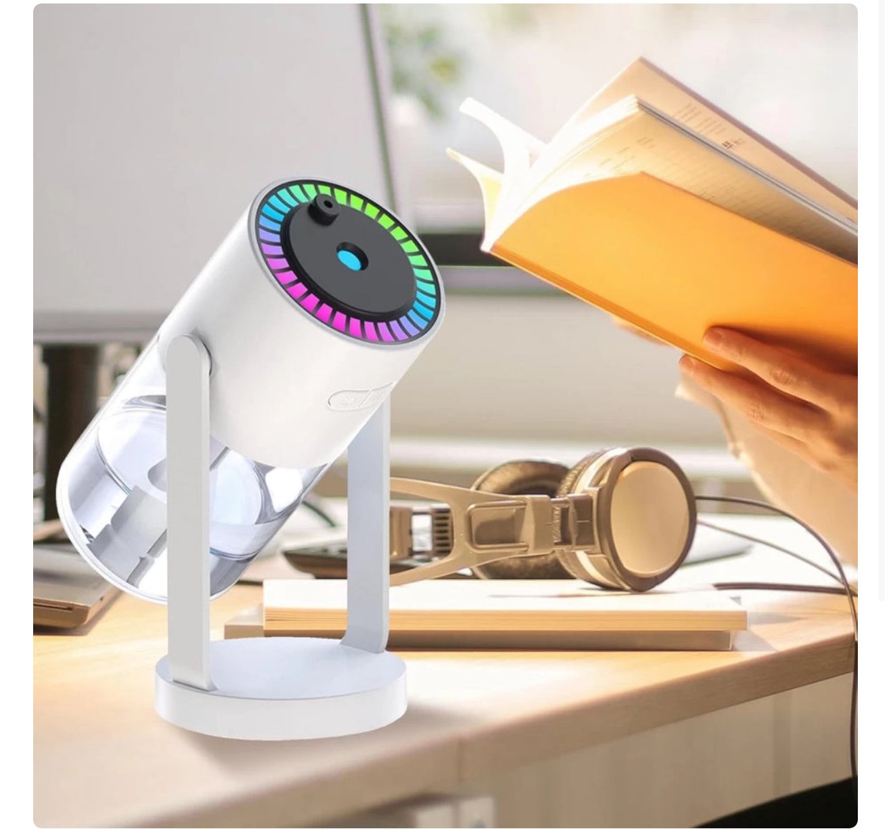 Difuzer modern për aromaterapi dhe lagështim ajri, me dizajn elegant dhe ndriçim LED shumëngjyrësh. Ideal për përdorim në shtëpi ose zyrë për të krijuar ambient relaksues dhe të këndshëm.