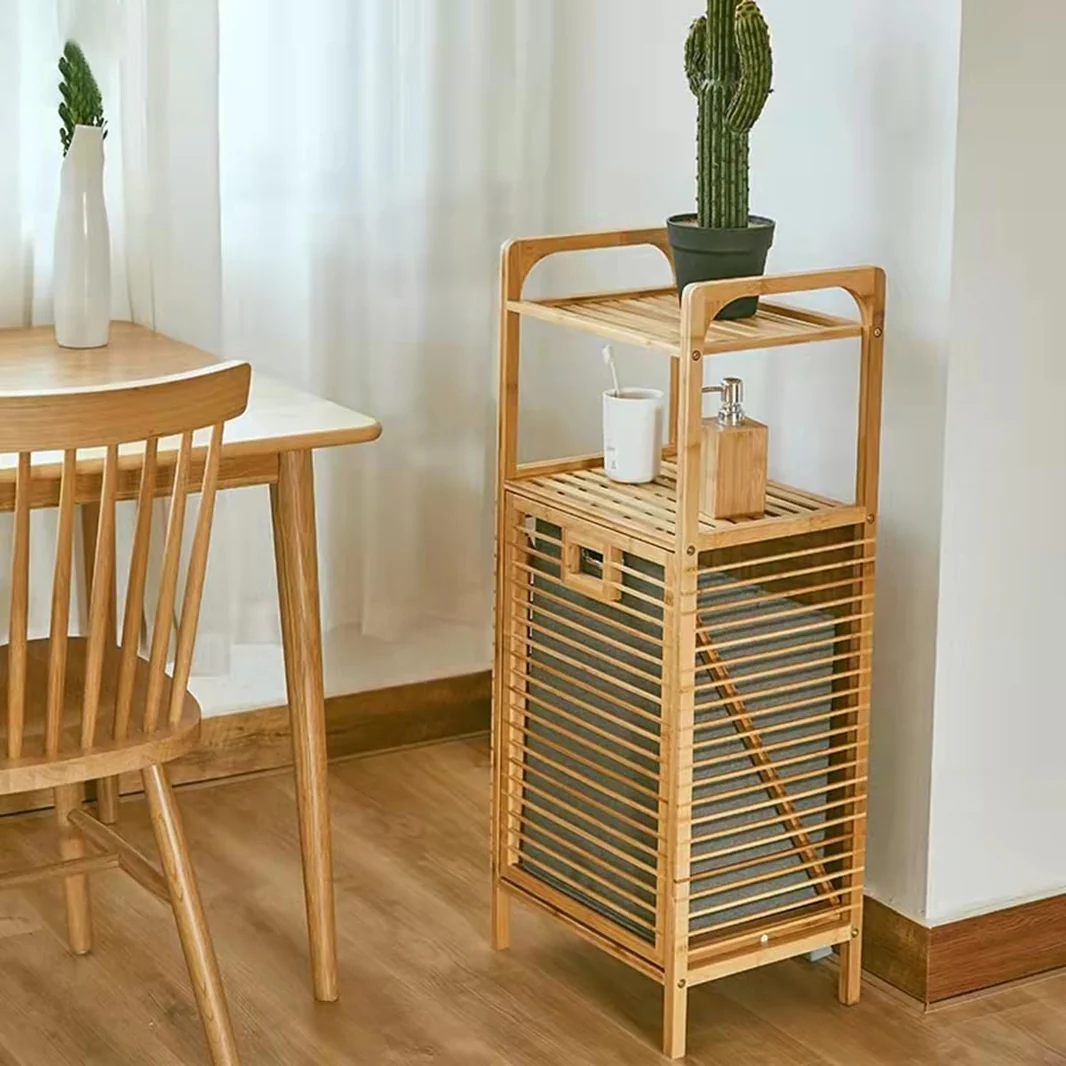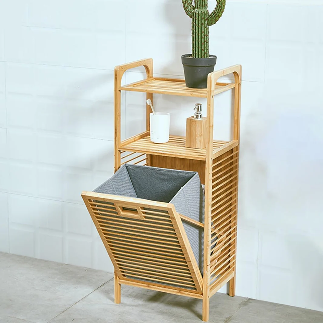 Dizajn natyral bambuje me shportë të madhe për rroba dhe rafte organizimi. Elegant, praktik dhe perfekt për banjo ose dhomë gjumi.