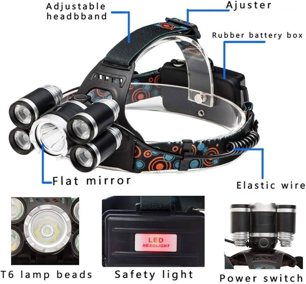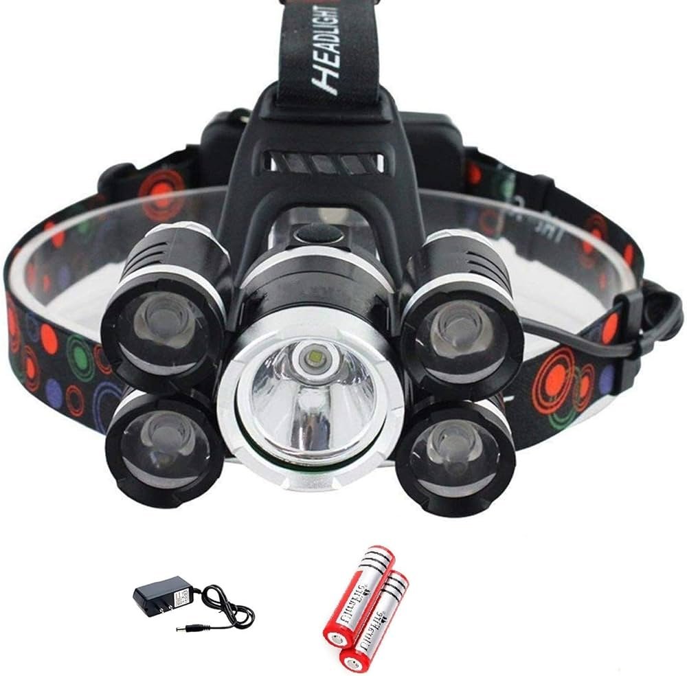 Lampë koke e fuqishme me disa LED, bateri të rikarikueshme dhe karikues.