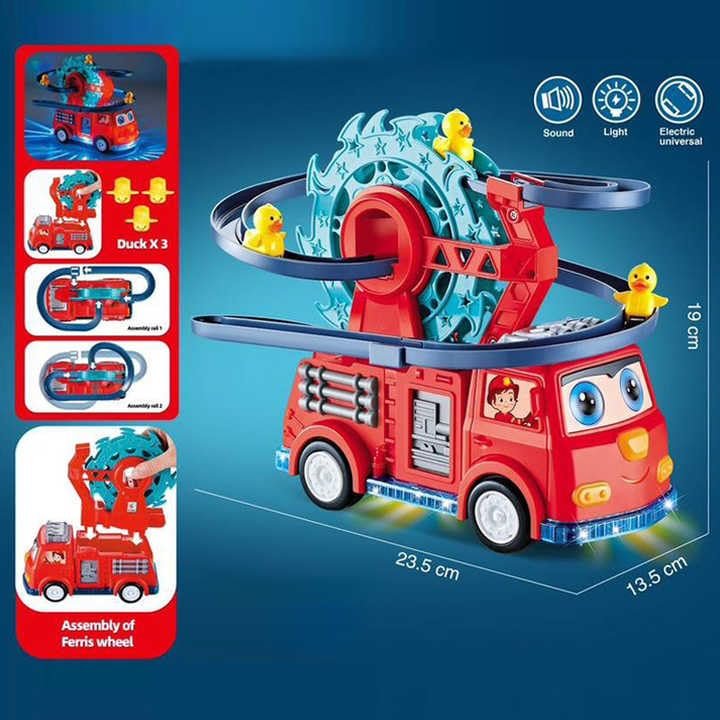 Kamion zjarrfikës me drita, muzikë dhe rosa që lëvizin në rrotullim.