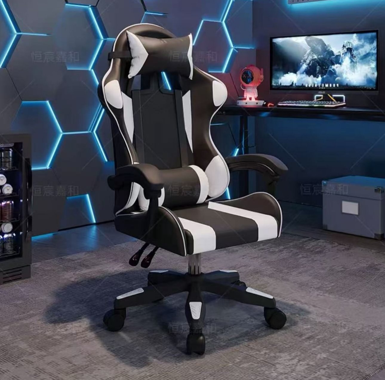 Karrige moderne për gaming dhe punë, me dizajn ergonomik dhe mbështetje të plotë për shpinën, qafën dhe krahët. E pajisur me jastëk komod, rrotullim 360°, mbështetëse këmbësh dhe rregullim të lartësisë për rehati maksimale. E disponueshme në ngjyrë bardh e zi, blu e zi, të zezë klasike dhe të kuqe e zi.