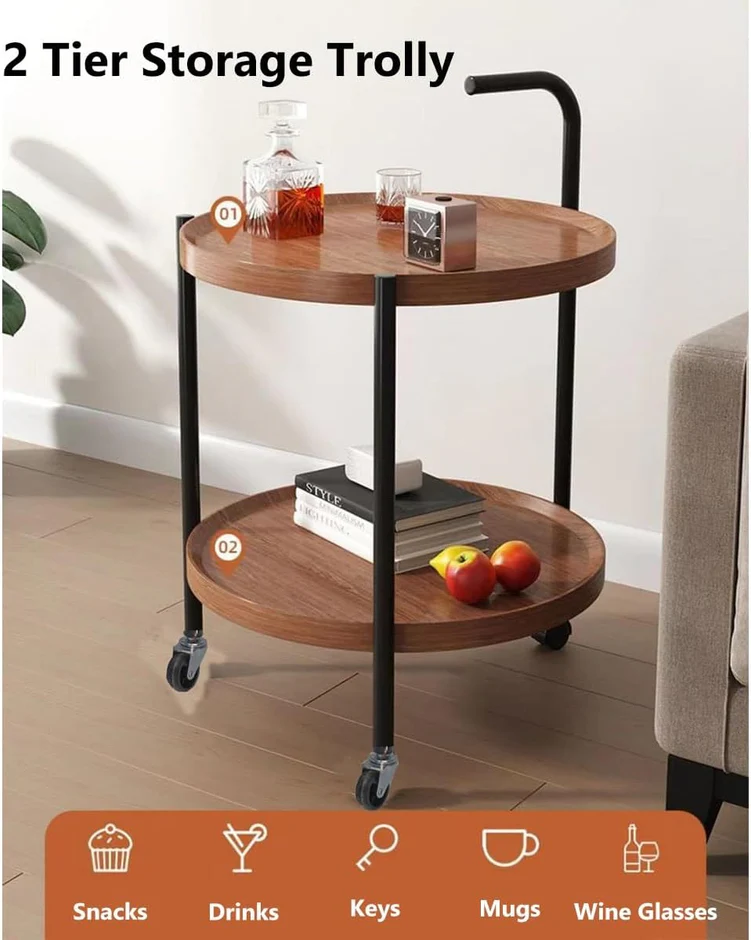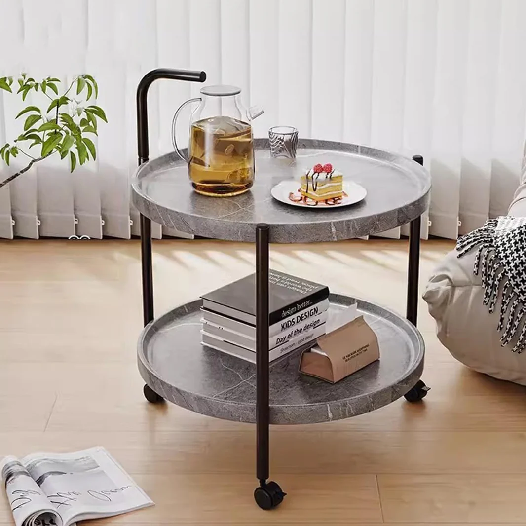 Karrocë moderne me dy kate dhe dizajn mermeri, ideale për servirje dhe organizim elegant të hapësirës.