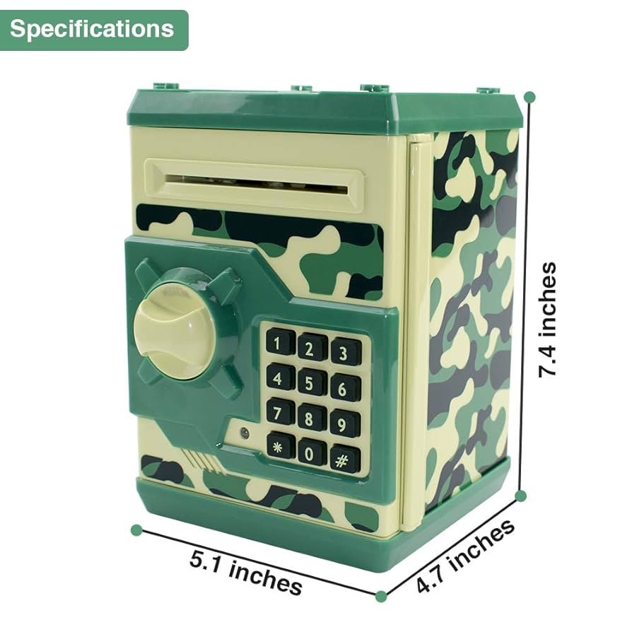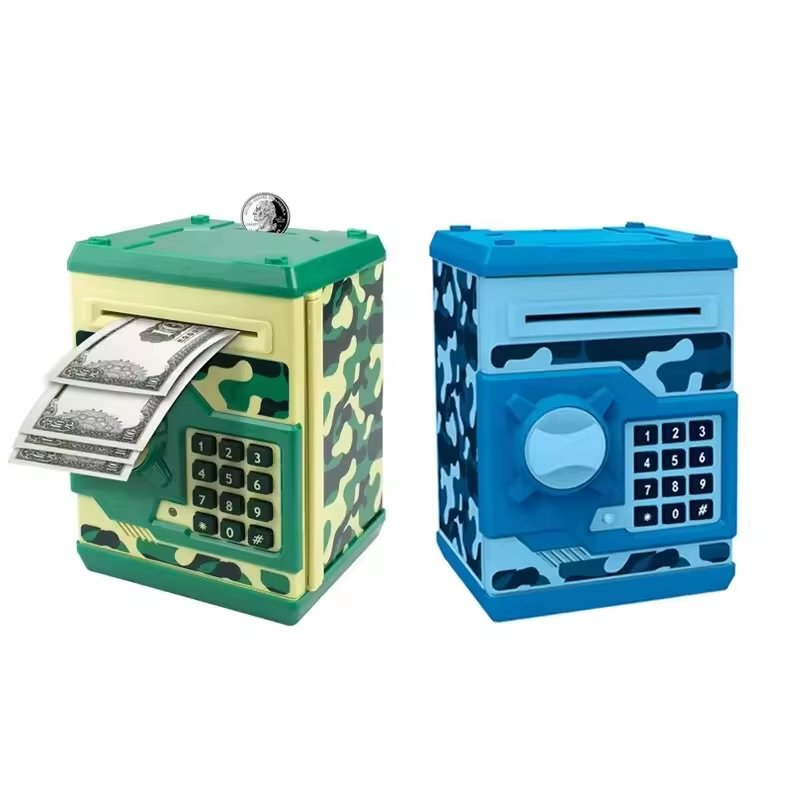 Kasaforta me dizajn modern dhe pamje kamuflazhi ofron një mënyrë argëtuese dhe edukative për fëmijët që të mësojnë për kursimin e parave. Me funksion elektronik për hapje me kod dhe sistem automatik të tërheqjes së parave, kjo lodër nxit ndjenjën e përgjegjësisë financiare që në moshë të hershme. E disponueshme në disa ngjyra dhe dizajne tërheqëse.