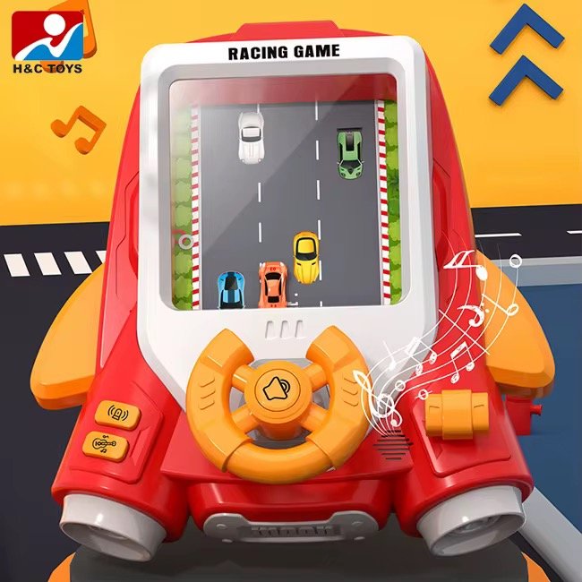 Lojë elektronike me timon dhe ekran për përjetim realist të garave rrugore për fëmijë.