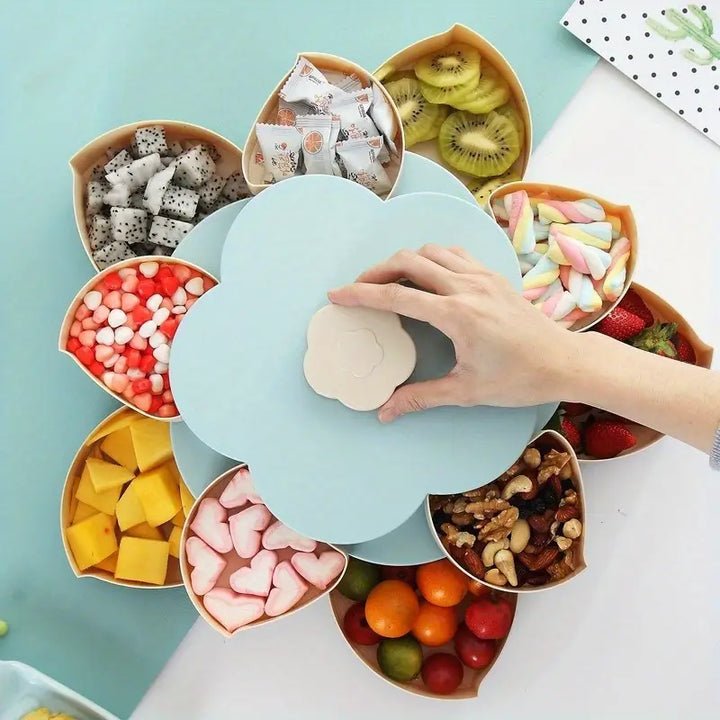 Kuti elegante me formë luleje dhe ndarje rrotulluese për ruajtje dhe servirje.