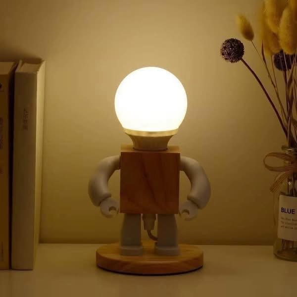 Llambë dekorative me bazë druri dhe dizajn kreativ në formë roboti.