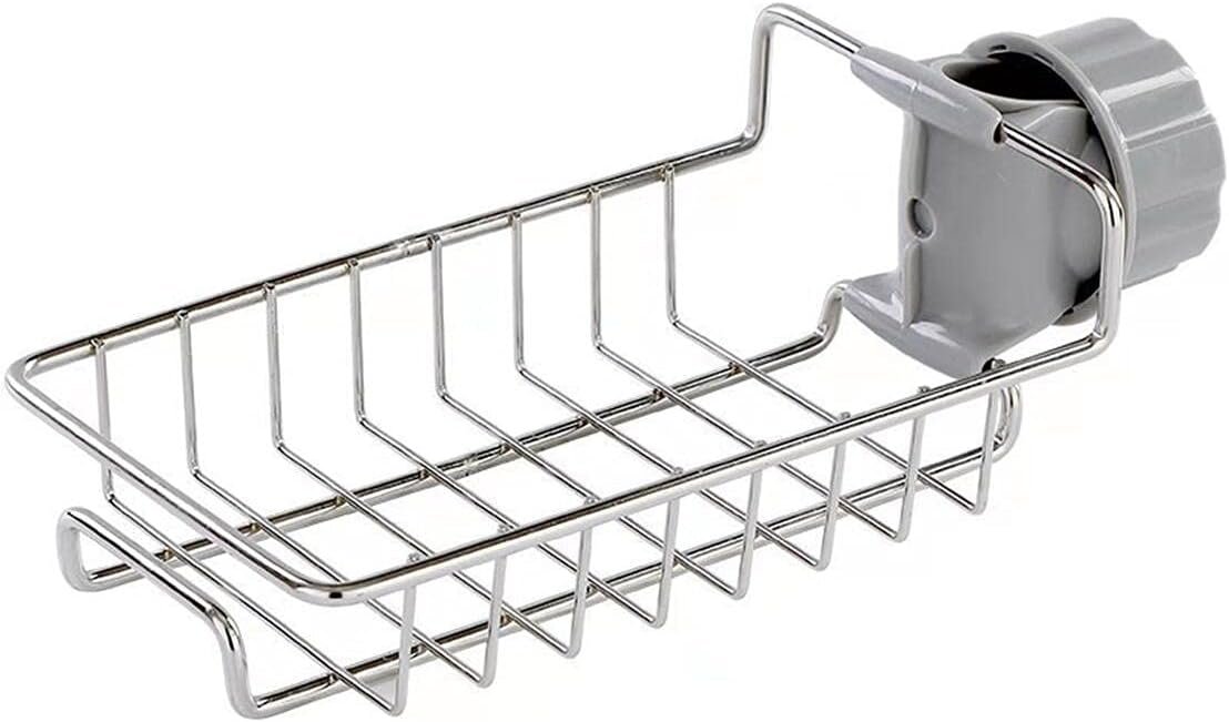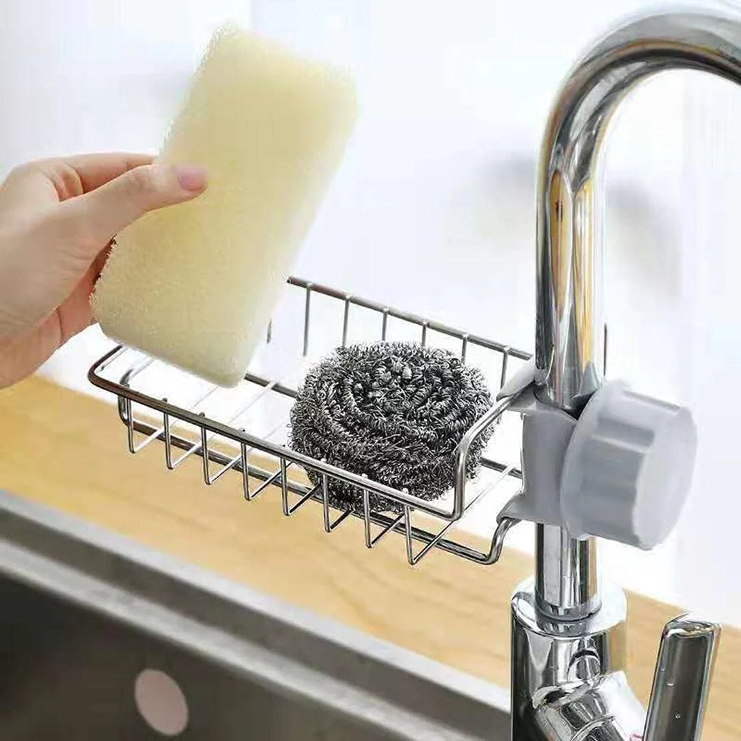 Raft inoksi për rubinet që mban sfungjerë dhe furça pastrimi.