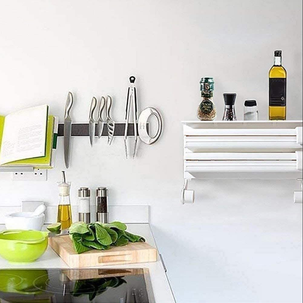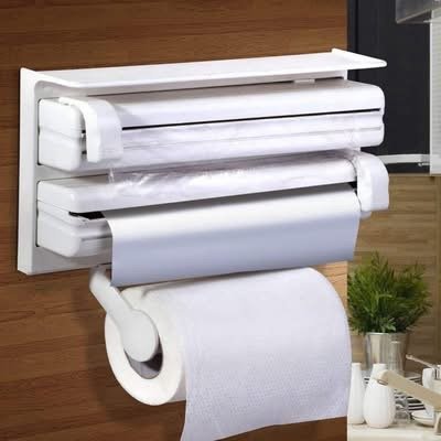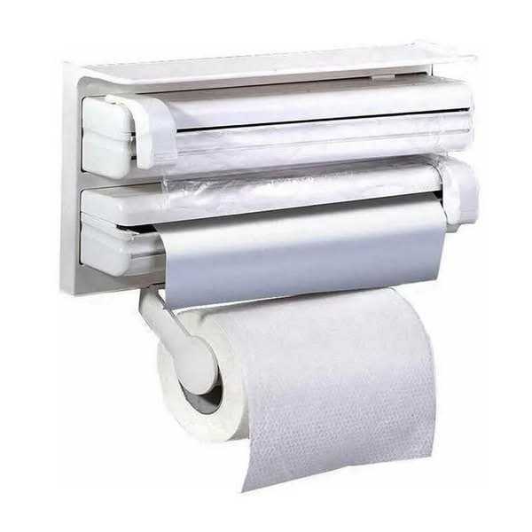 Mbajtës muror 3-në-1 për letër kuzhine dhe fletë plastike me prerëse të integruara.