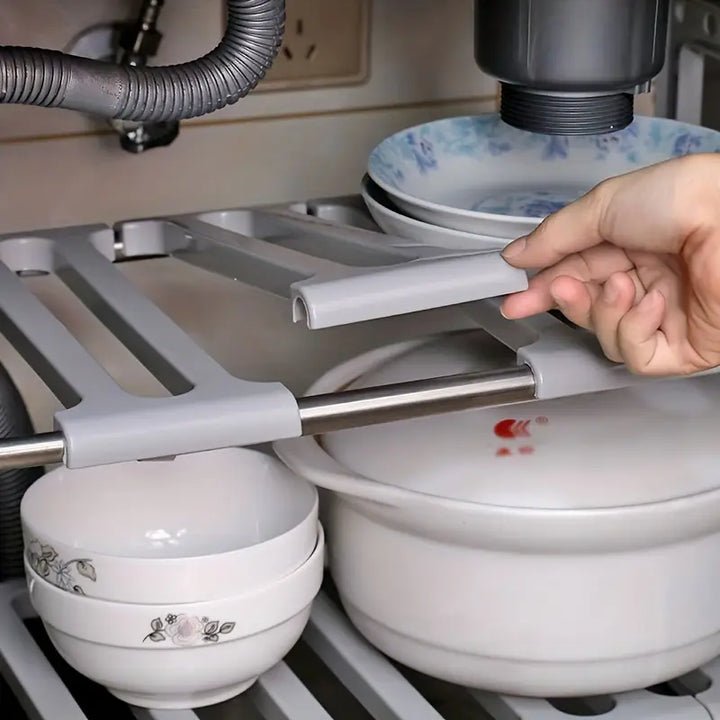 Raft i zgjerueshëm dhe i rregullueshëm, perfekt për vendosjen e tenxhereve, tasave dhe enëve të mëdha.