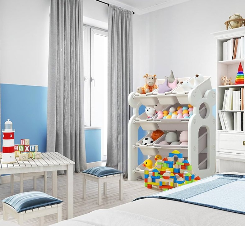Raft praktik me 9 kuti të pjerrëta për organizimin e lodrave në mënyrë të lehtë dhe tërheqëse për fëmijët. Dizajn modern me formë të qëndrueshme dhe hapësirë të mjaftueshme për çdo lloj lodre apo aksesori. Përmasa: 86 x 86 x 36 cm.