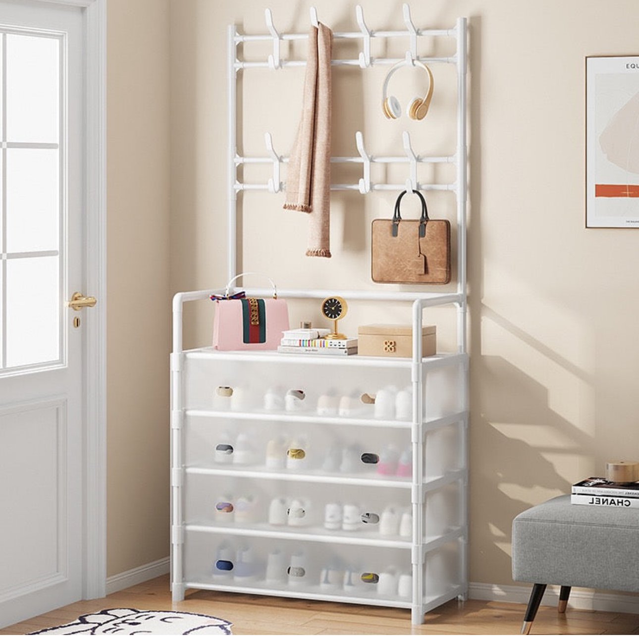 Rafte praktik për rrobash dhe këpucë, i kombinuar me varëse të shumta dhe sirtarë të gjerë për organizim maksimal. Dizajn modern, i qëndrueshëm dhe i përshtatshëm për çdo ambient shtëpie. Disponohet në ngjyrë të zezë dhe të bardhë.