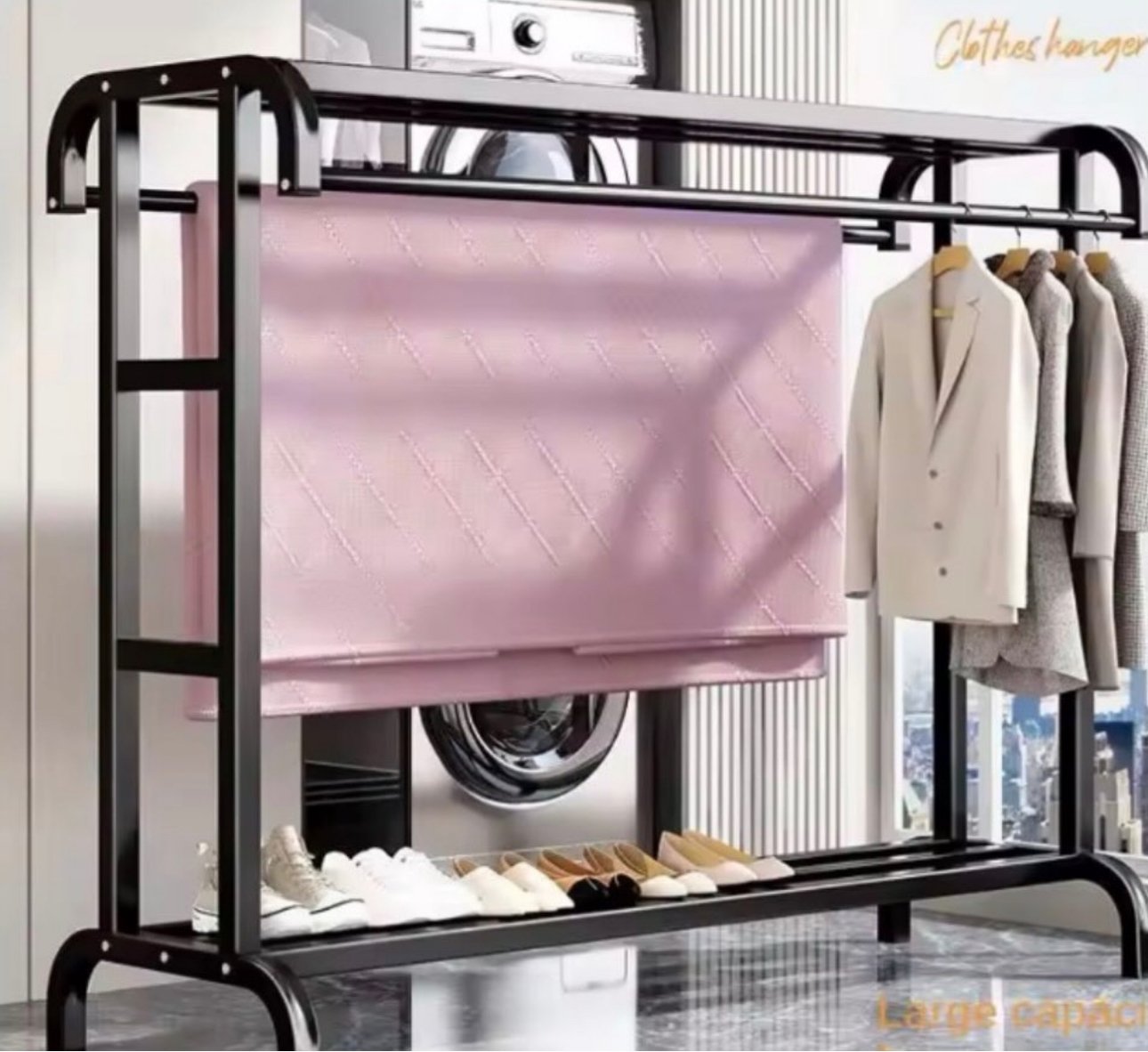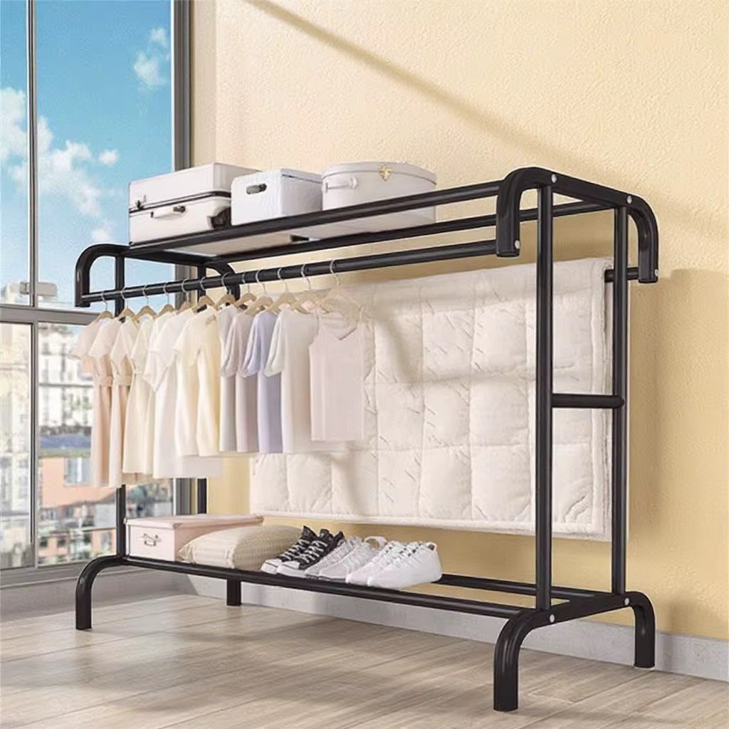 Rrobëvarës praktik me konstruksion të fortë metalik dhe dizajn të dyfishtë për tharje dhe ruajtje rrobash. Ofron hapësirë të bollshme për varjen e rrobave, si dhe rafte shtesë për këpucë apo kuti. Me dimensione 100x47x152 cm, është ideal për shtëpi, lavanderi apo dhoma gjumi. Lehtë për montim dhe qëndron i qëndrueshëm falë bazës së fortë.