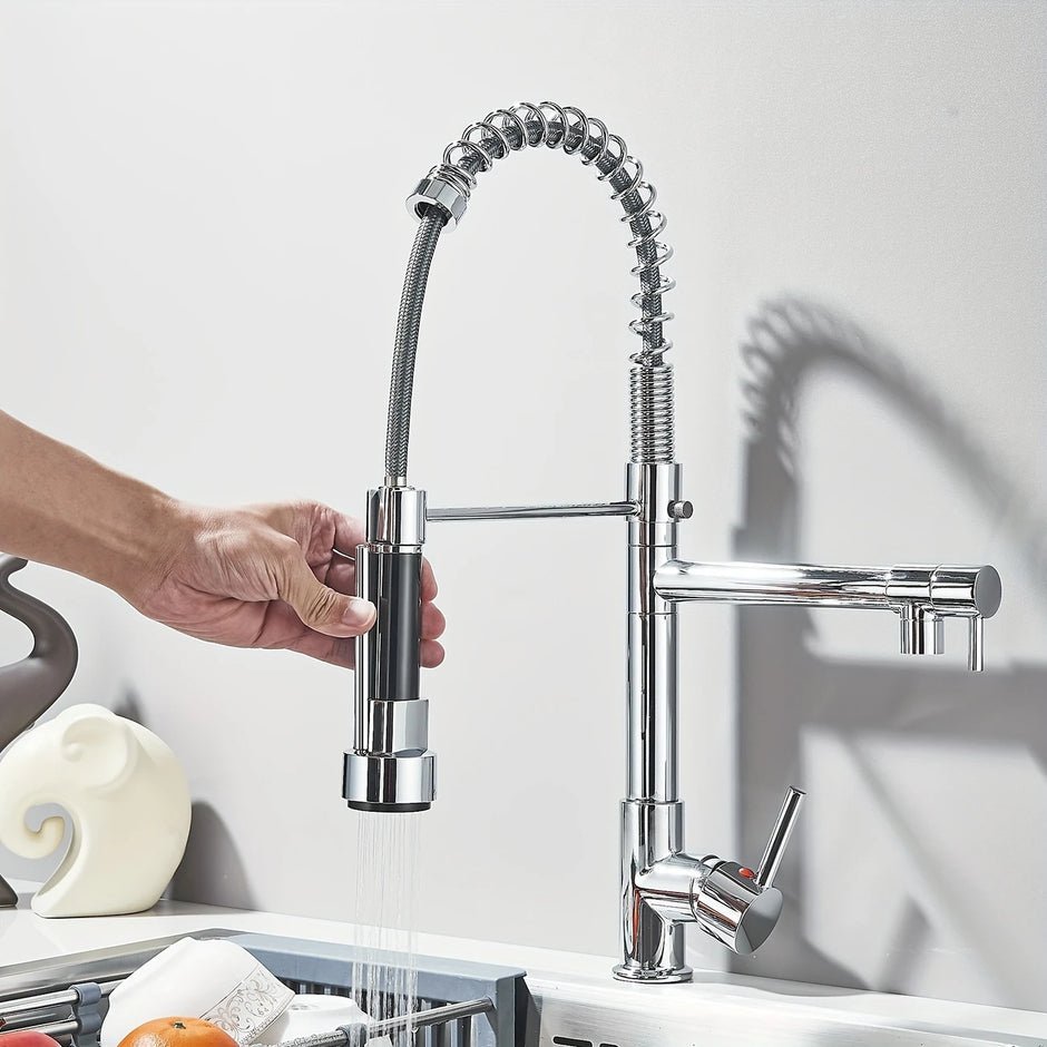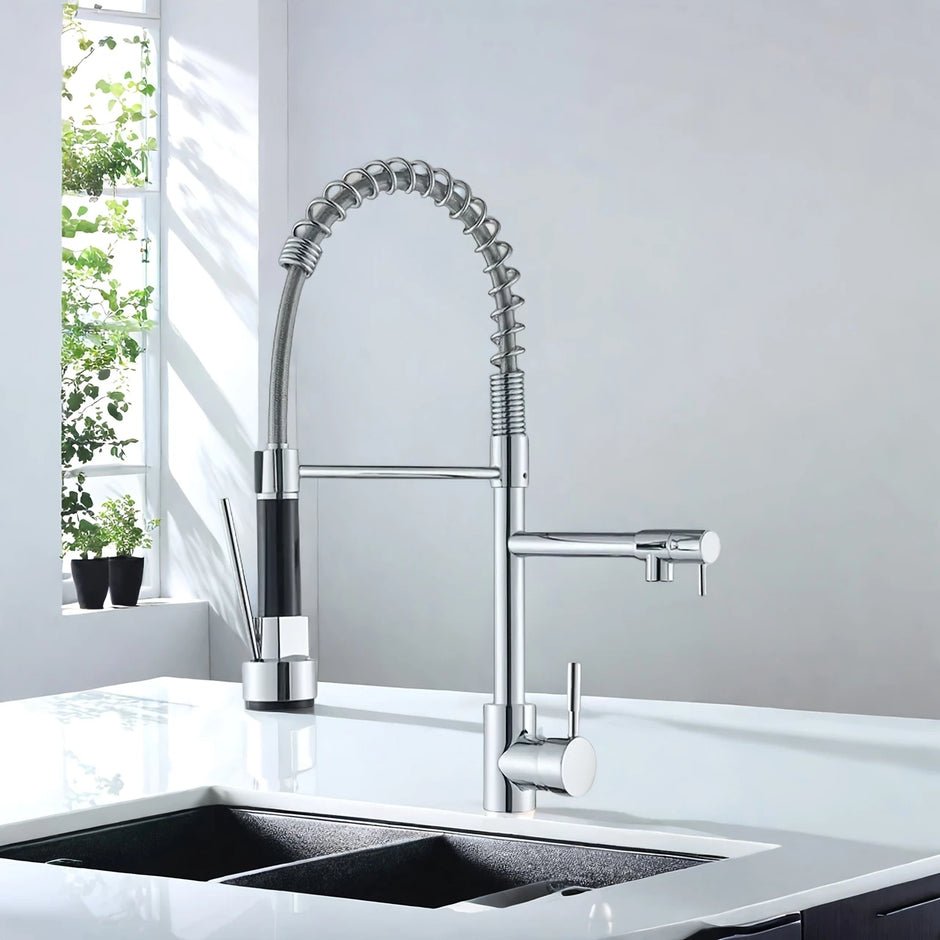 Rubinet profesional me dy dalje uji — grykë fleksibile për larje dhe dalje fikse për mbushje.