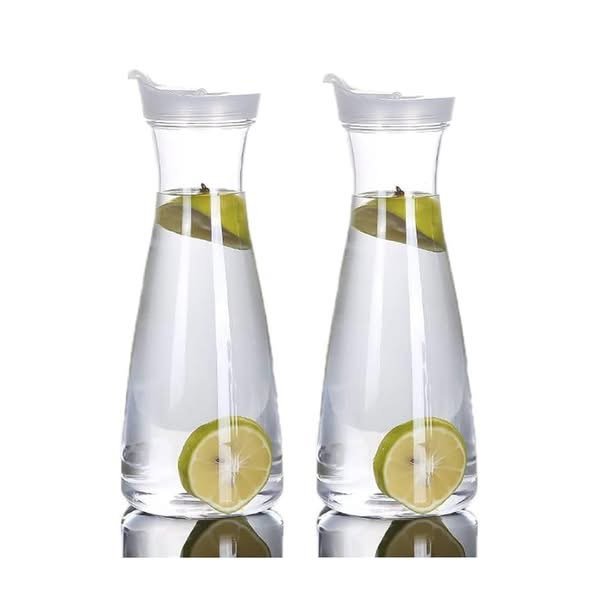 Set me 2 karafila elegantë qelqi, të përshtatshëm për servirjen e ujit, lëngjeve apo çajrave të ftohtë. Me kapak praktik që ruan freskinë dhe pastërtinë.