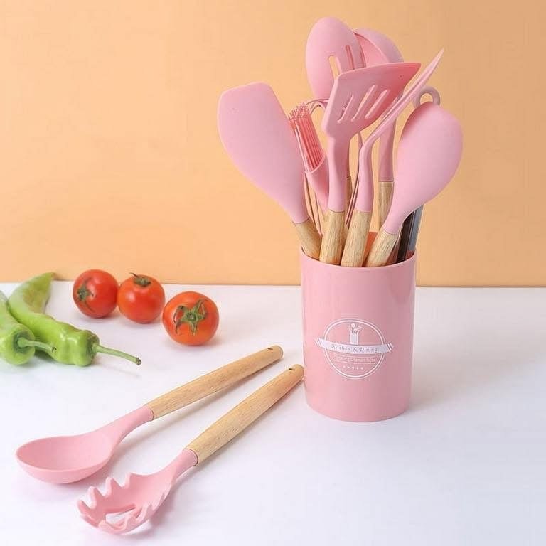 Set prej 14 pjesësh me aksesorë kuzhine nga silikoni dhe druri, i kompletuar me enë mbajtëse.