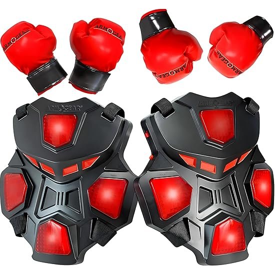 Set boksi me doreza dhe jelek mbrojtës për lojëra aktive dhe të sigurta mes fëmijëve. Jeleku përmban zona me drita që aktivizohen kur goditet, duke e bërë lojën më emocionuese dhe interaktive. Ndihmon në zhvillimin fizik, koordinimin dhe energjinë pozitive përmes aktivitetit sportiv.