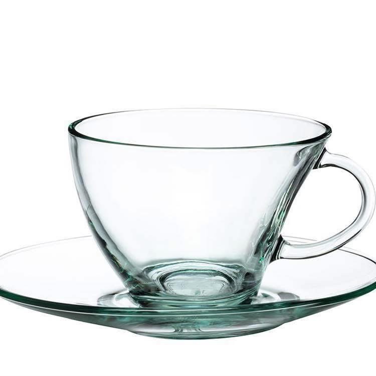 Komplet filxhanësh qelqi me pjata të vogla, ideal për kafet e përditshme.