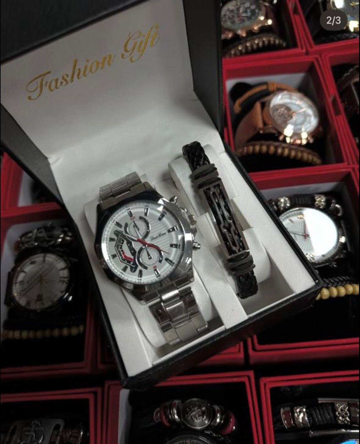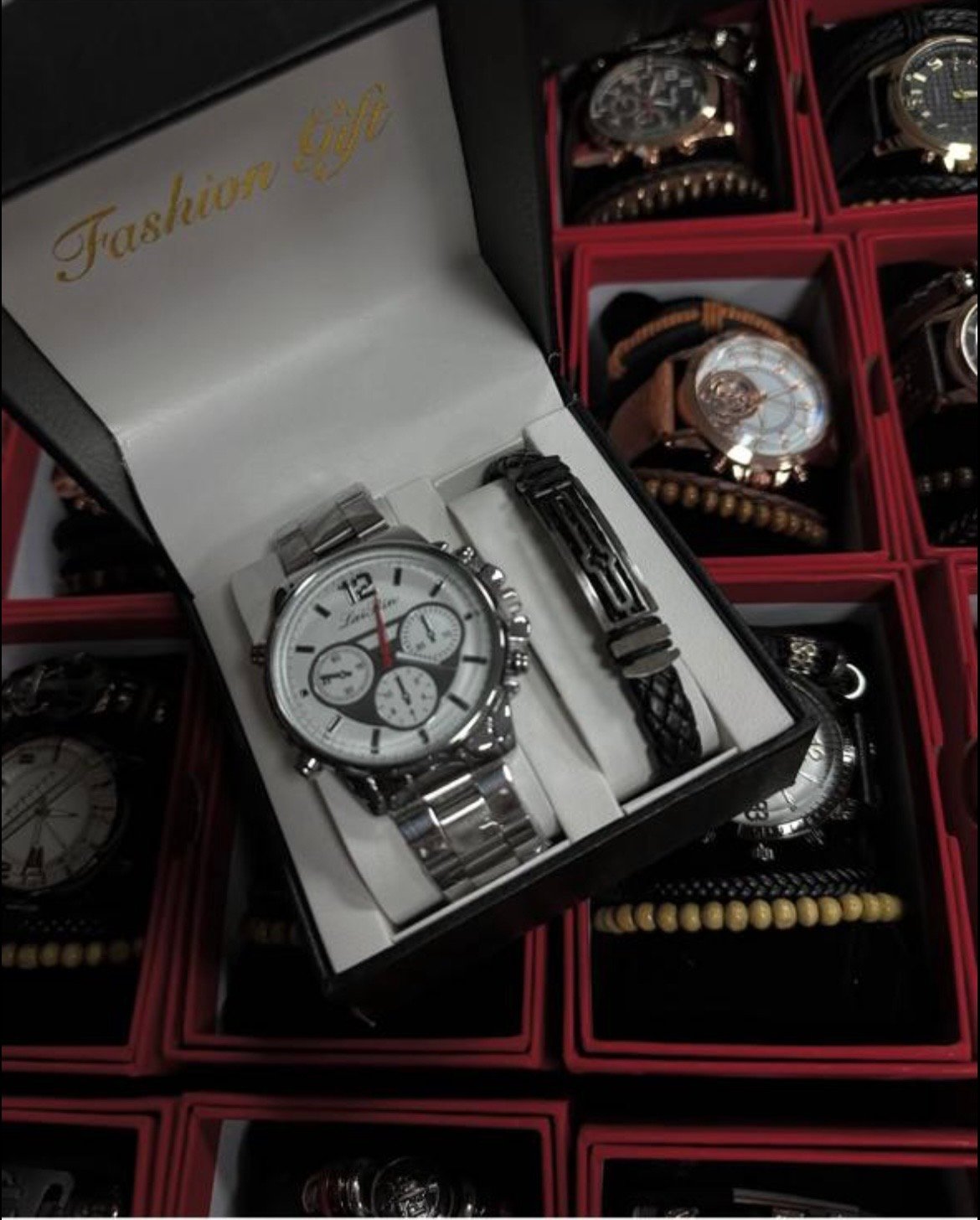 Set elegant për meshkuj, orë metalike me dizajn klasik dhe byzylyk modern, ideal për dhuratë.