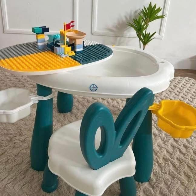 Tavolinë dhe karrige me vend për lego, ideale për lojëra dhe mësim.