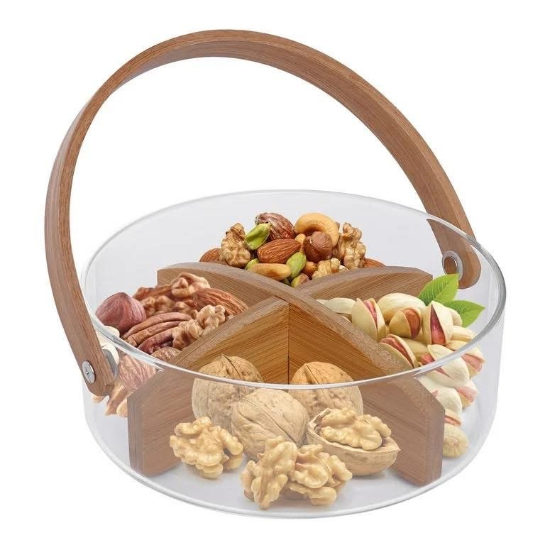 Shportë qelqi me ndarje bambuje dhe dorezë druri, ideale për servirje të arrave dhe ëmbëlsirave