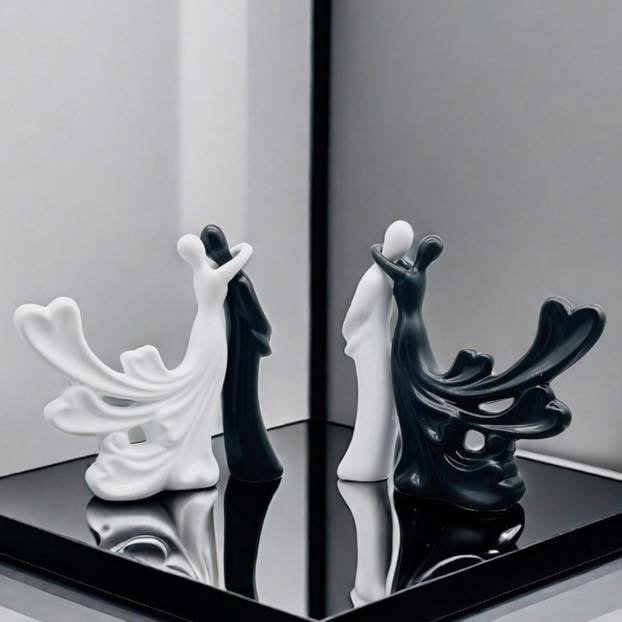 Statujë dekorative bardh e zi që simbolizon dashurinë dhe elegancën e çiftit.