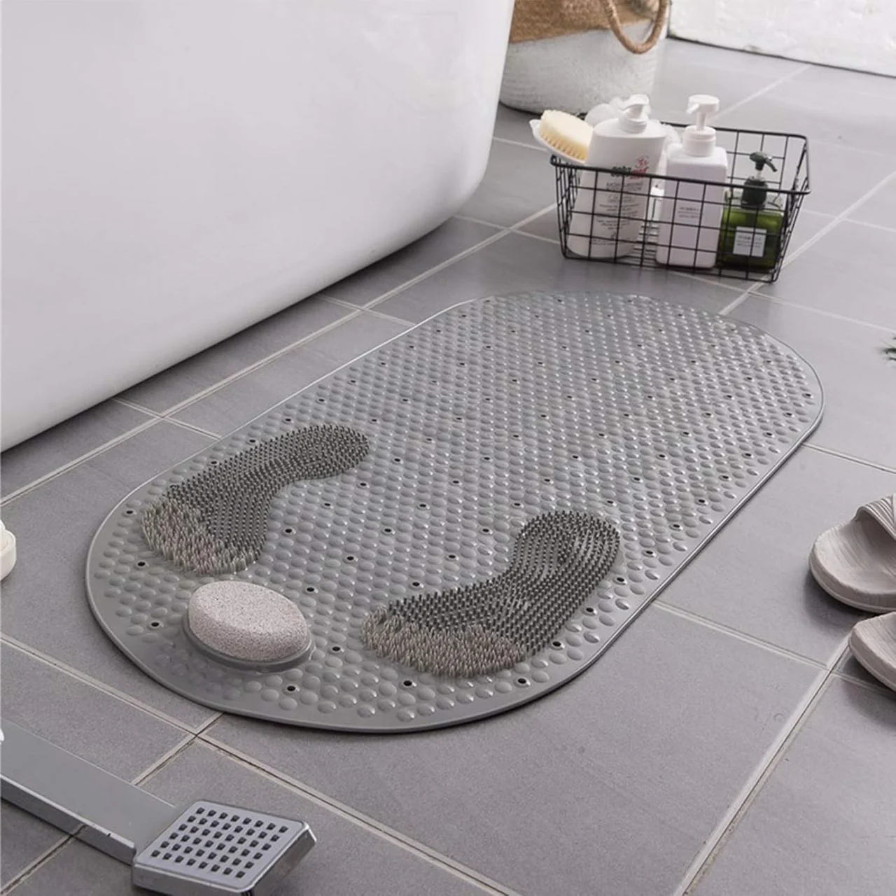 Tapet masazhues me qindra pika, furça pastruese dhe gur zmerile për thembrat. Ideal për dush.