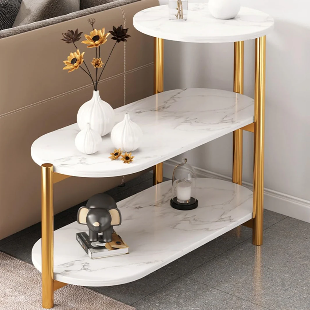 Tavolinë e hollë anësore me 3 nivele dhe sipërfaqe rezistente. E përsosur për vendosjen e dekorimeve, librave apo aksesorëve të dhomës së ndenjës.