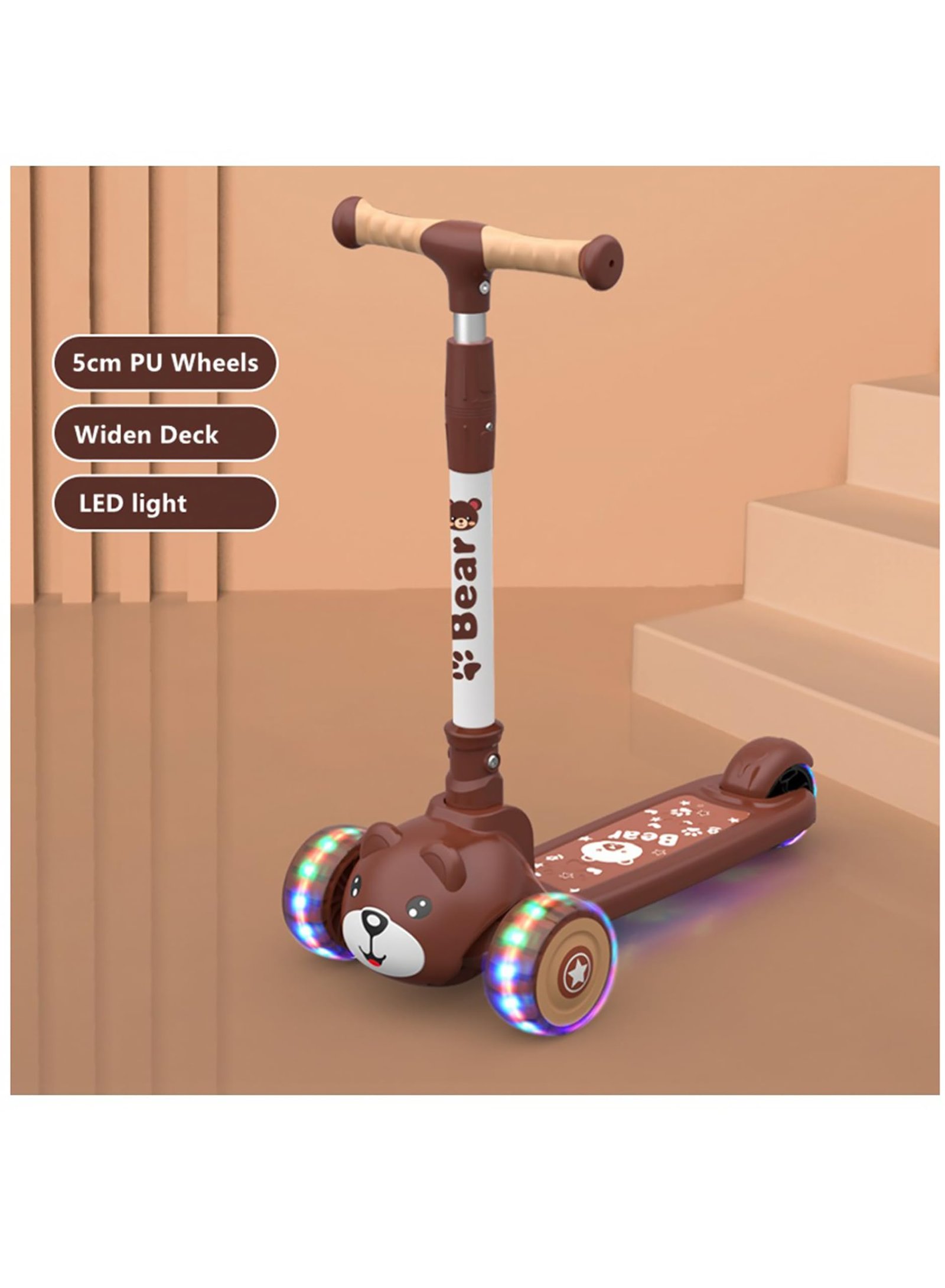 Trotinet ngjyrë kafe me dizajn arushi dhe rrota me drita.
