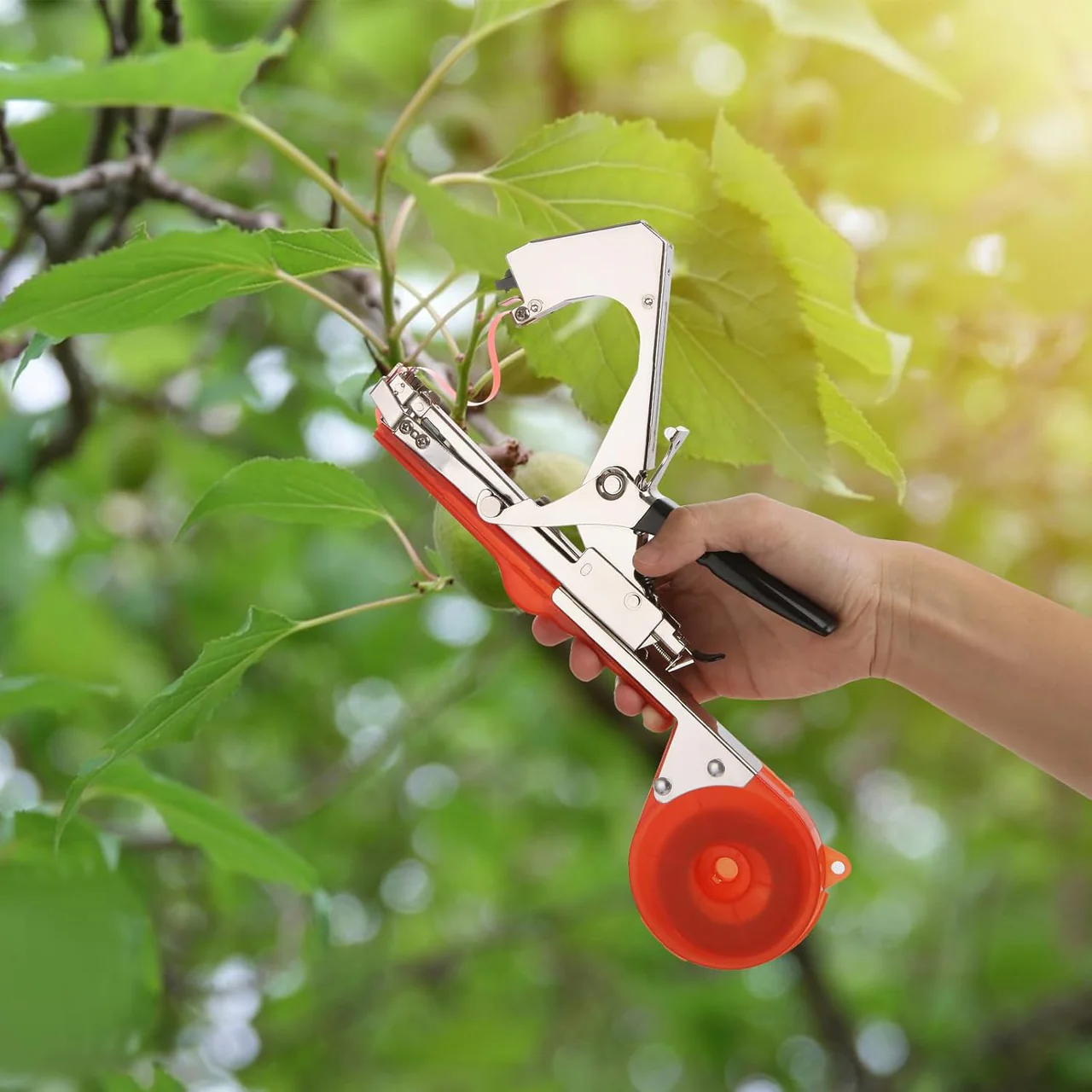 Ky tapener automatik lidh degët e pemëve, perimeve apo luleve shpejt dhe saktë.